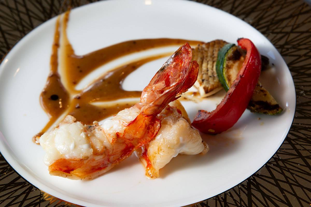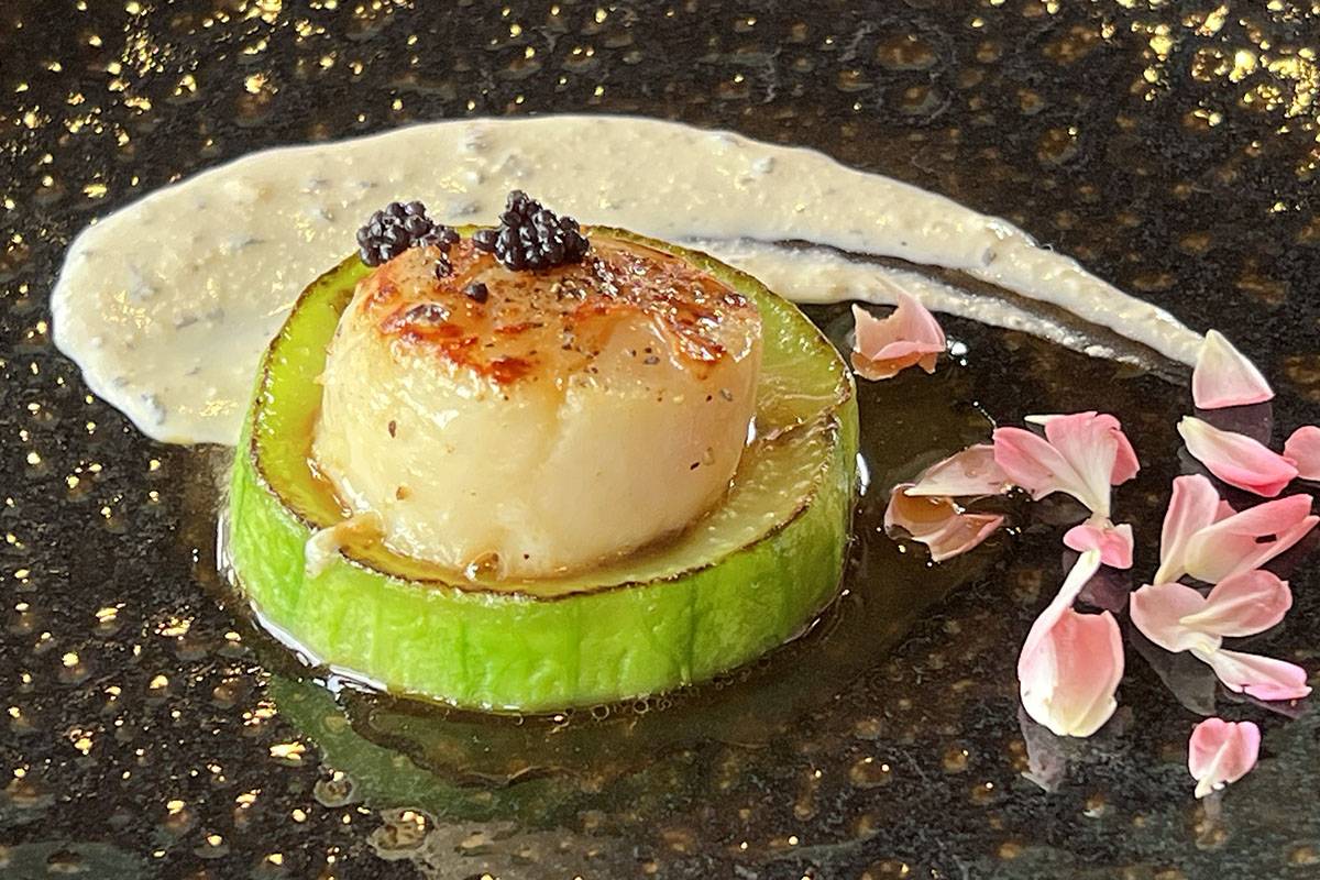 主餐: 日式香菇飯、季節鮮魚、煎北海道大干貝、煎野生海草蝦佐蜜汁芥末醬汁、煎活鮑魚佐日式和風醬